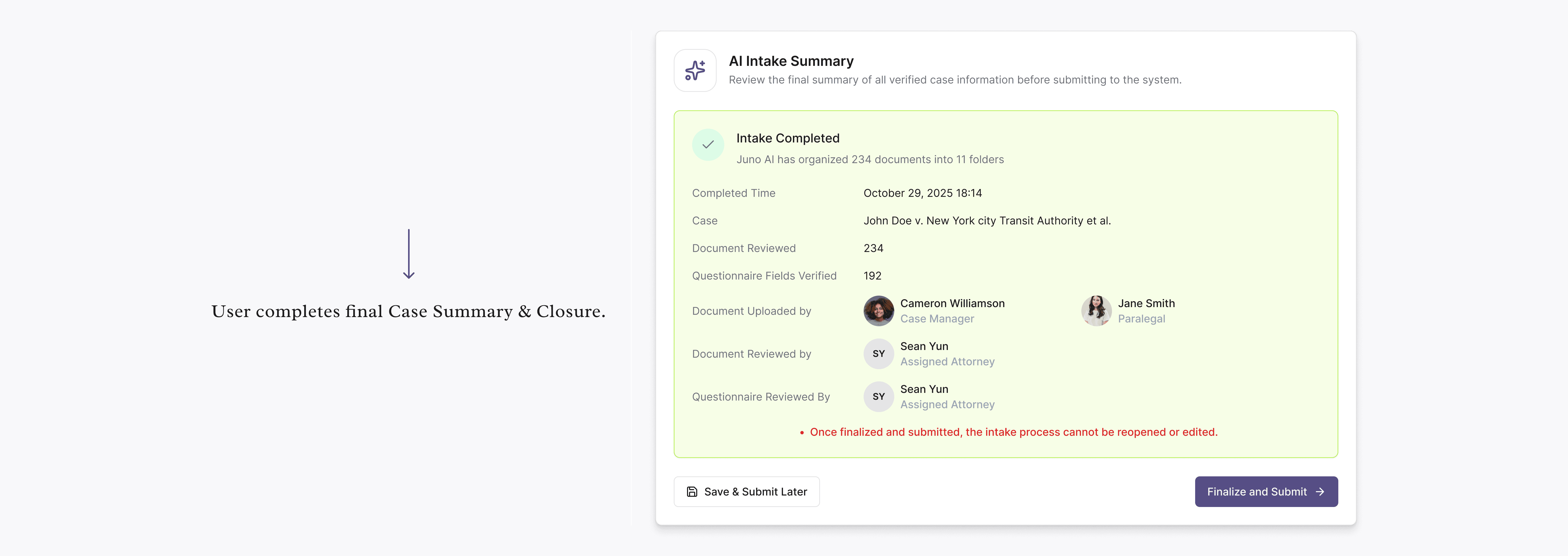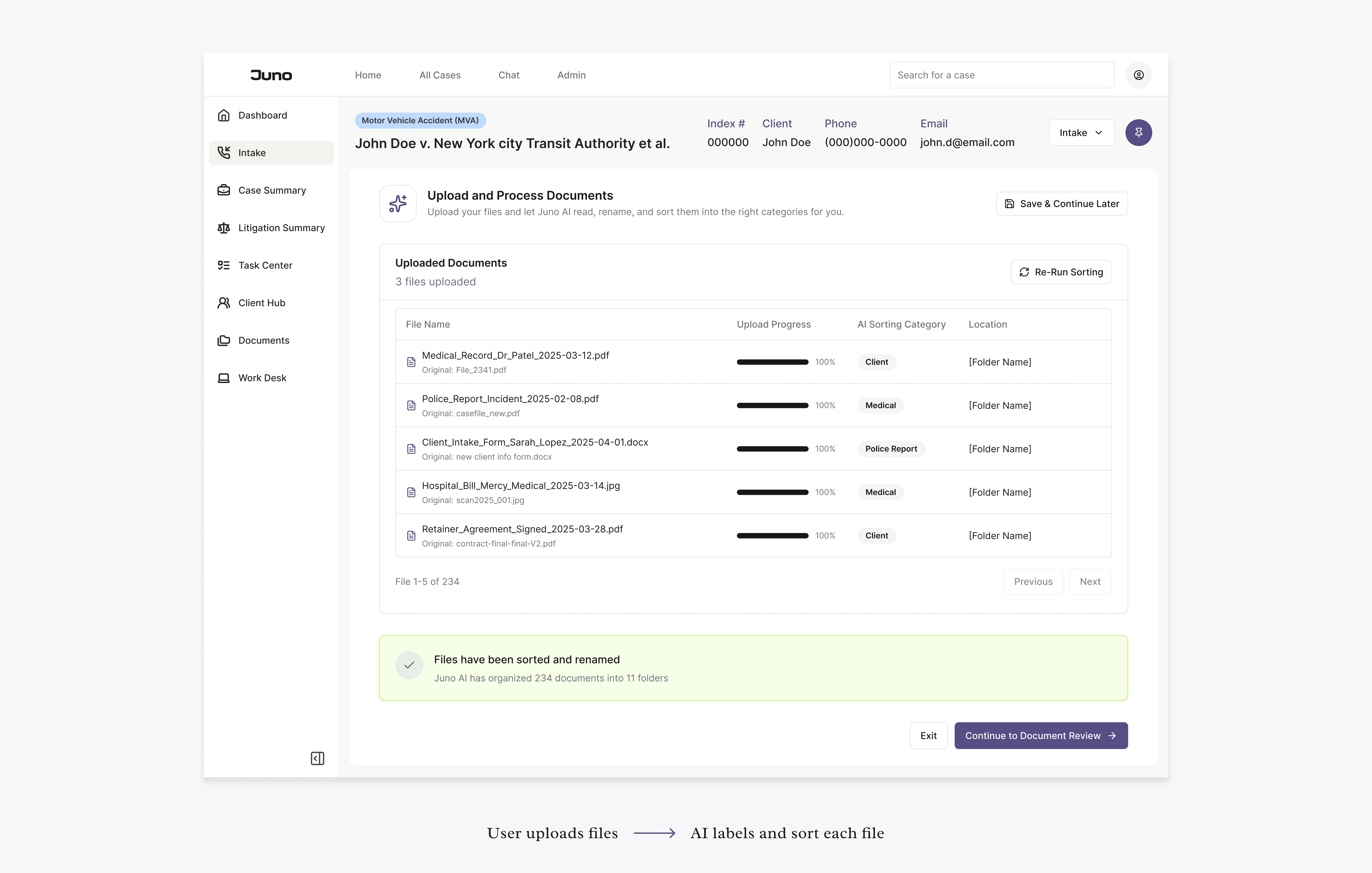 In litigation, every case begins as chaos — hundreds of unstructured documents that must be organized before real work can start. Juno’s AI Intake transforms that step into intelligence. Instead of treating uploads as a passive feature, it actively reads, labels, and organizes each file, identifying parties, facts, and deadlines to build a structured case knowledge base.