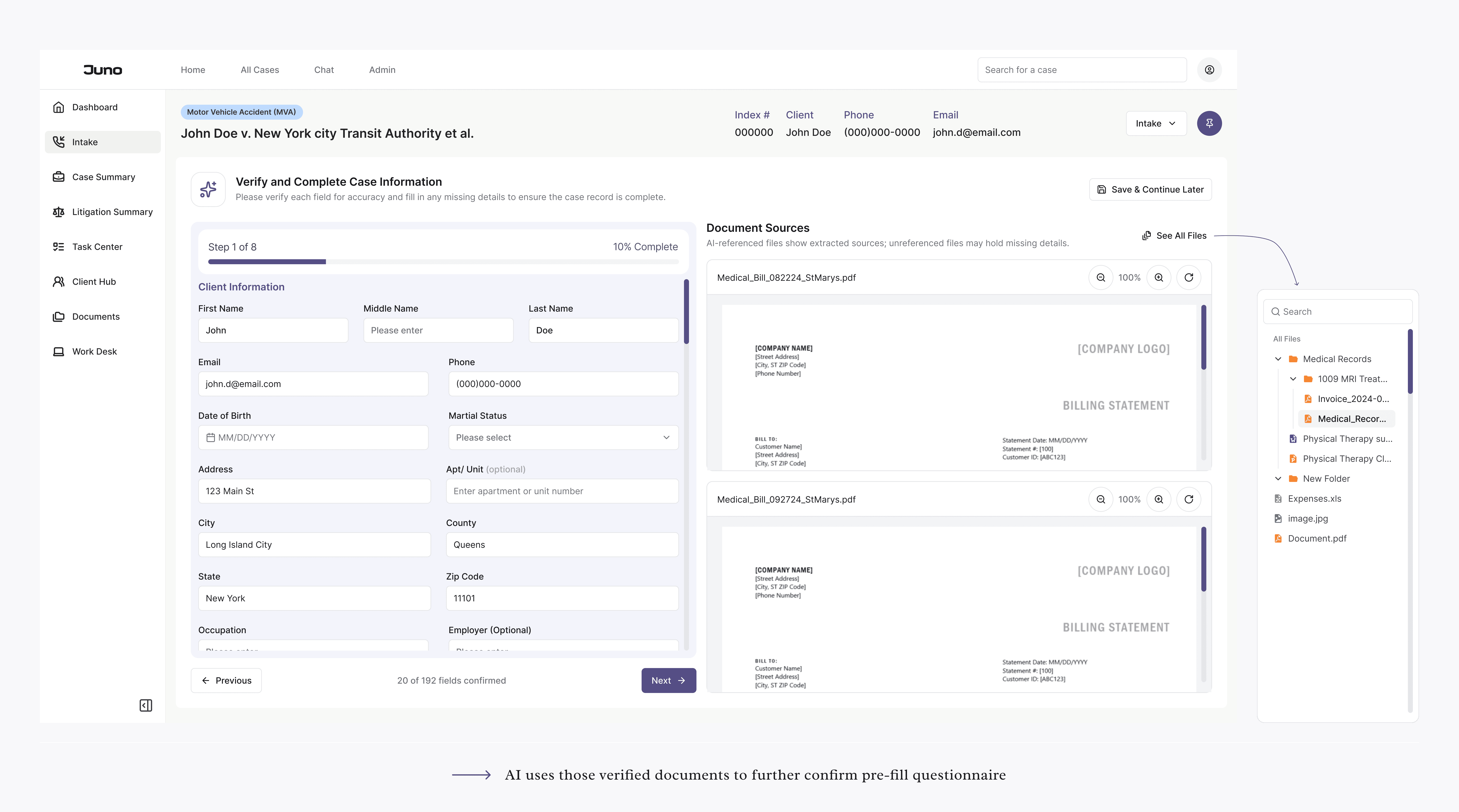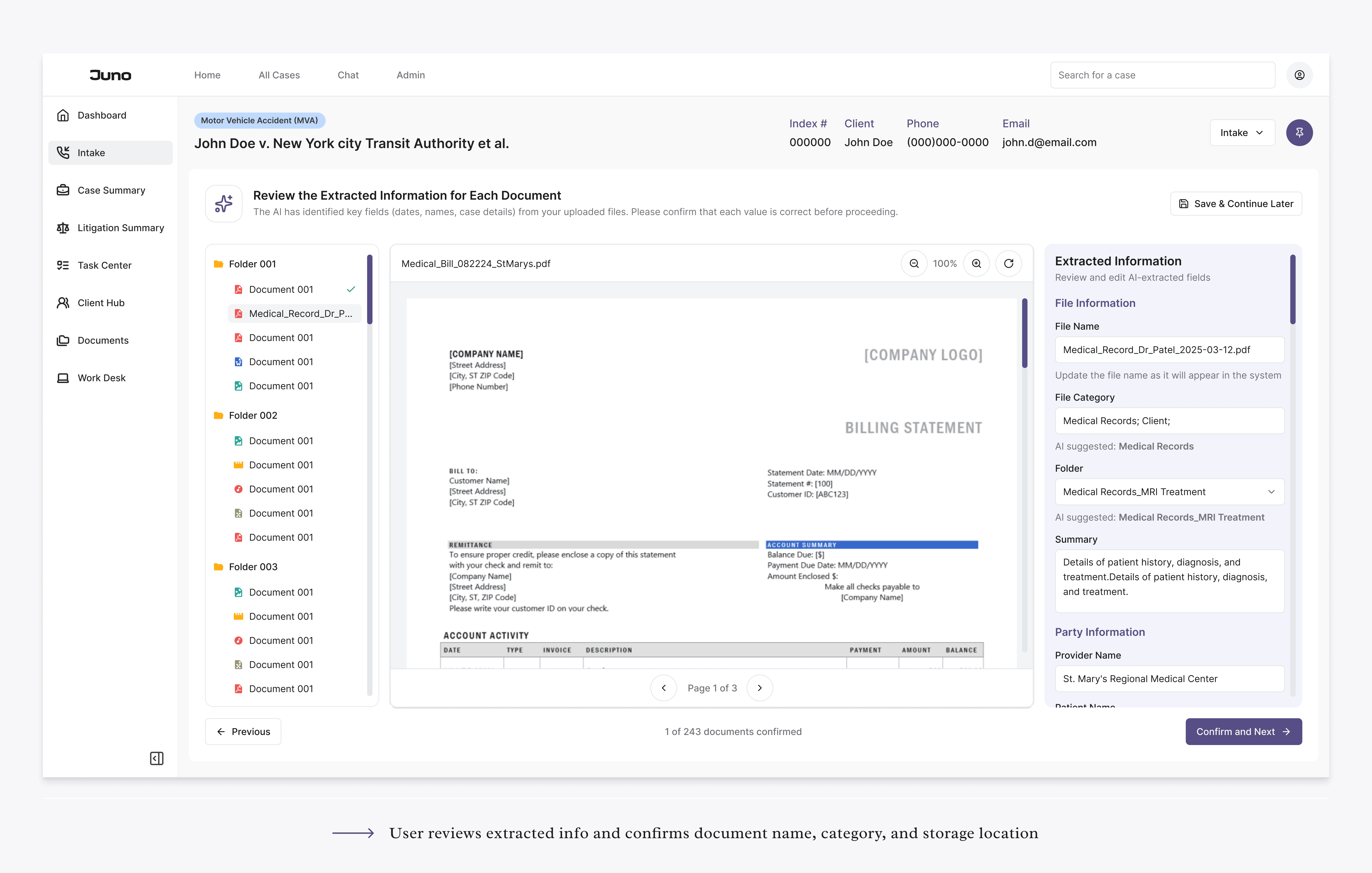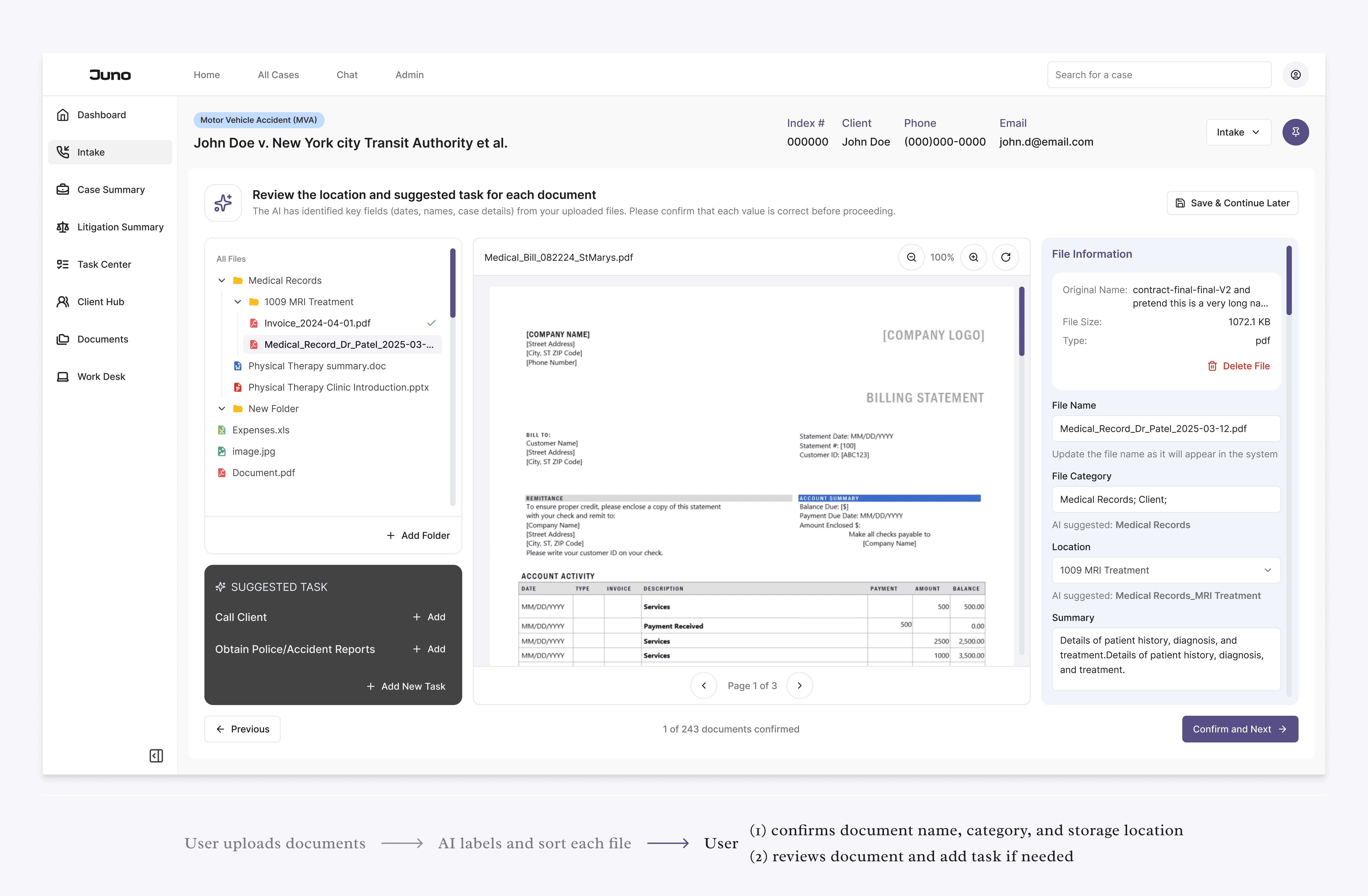 As users confirm each document’s name, category, and storage location, Juno simultaneously analyzes the content and surfaces AI-suggested tasks (e.g., “Request updated medical record,” “Schedule deposition for listed witness”).