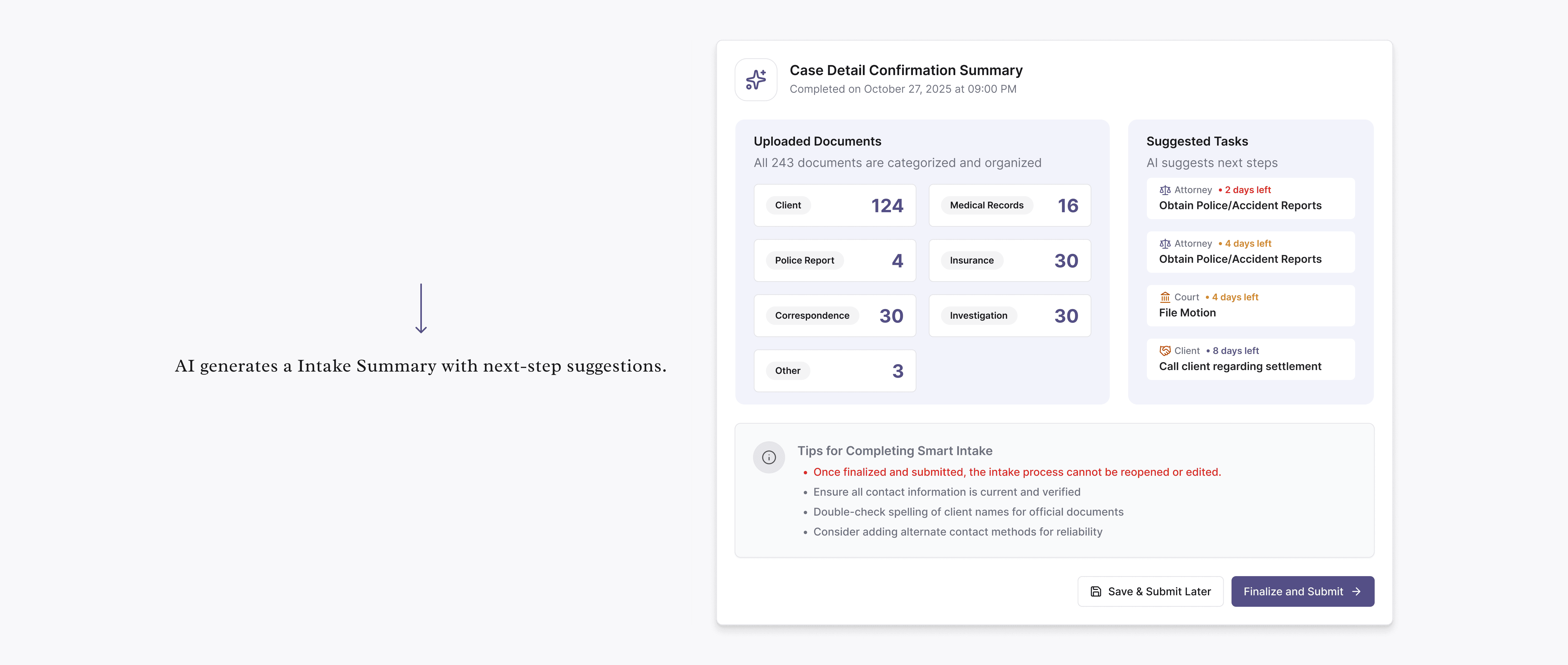 After all documents were processed, AI produced a concise intake summary that reported how many files were labeled successfully, flagged files requiring review, and suggested follow-up tasks such as “Review missing medical record,” “Draft demand letter,” or “Verify accident details.”