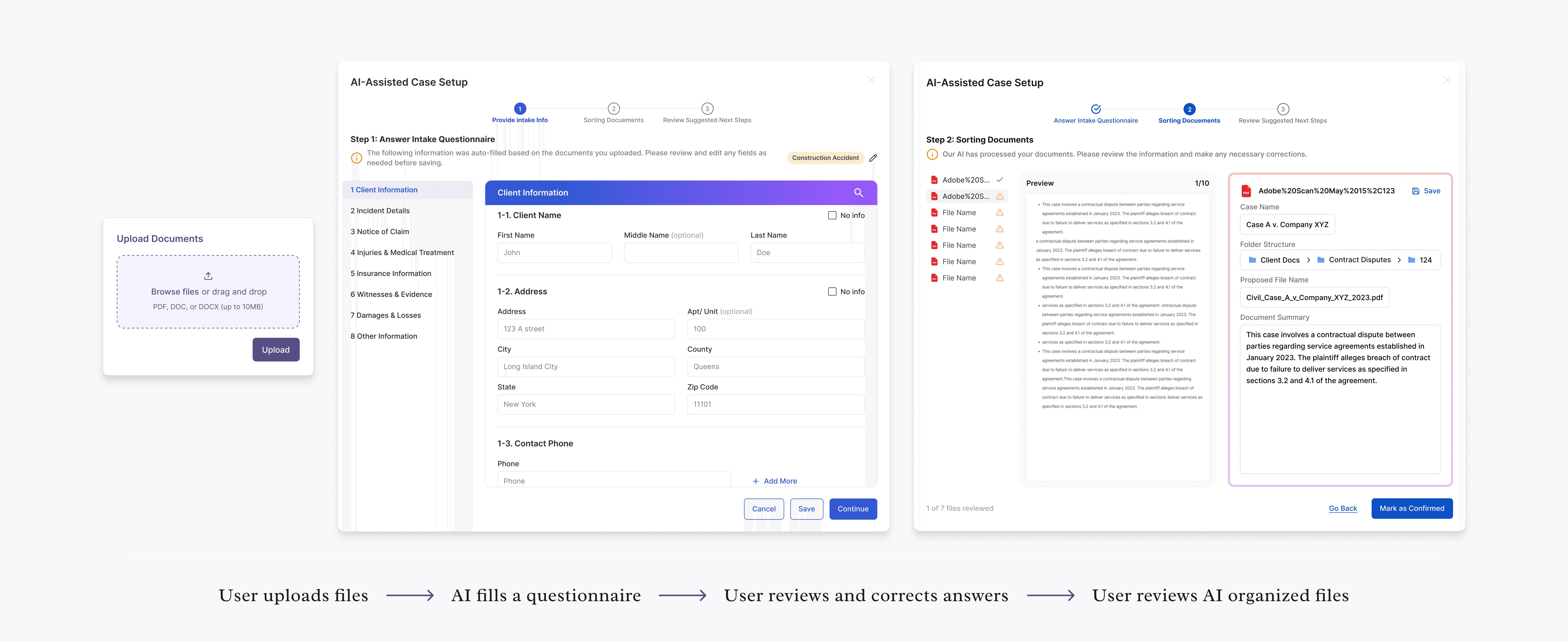 In this iteration, we identified that task discovery naturally occurs during document review—the moment when users engage most deeply with the case materials. To support this behavior, we deliberately merged document review, information confirmation, and task suggestion into a single integrated step.