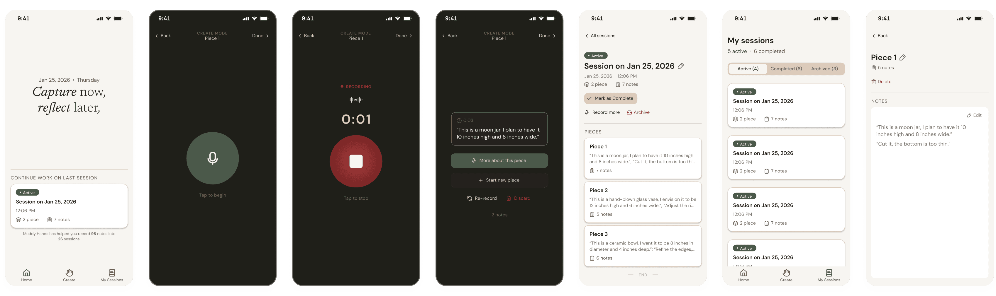MuddyHands enables one-tap voice capture during making and defers editing, summarization, and curation to a later reflection phase. By separating capture from sense-making, the app preserves creative flow while still producing meaningful, organized documentation.
